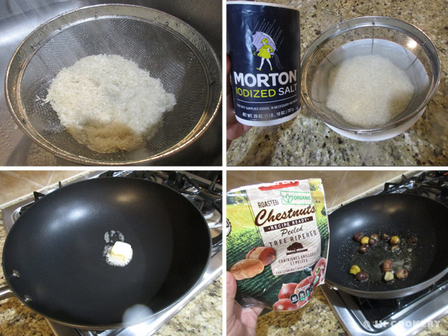 Wash rice in a strainer till water runs almost clear. Set rice and strainer in a large bowl with water and 1 tablespoon salt. Let soak while preparing the fruit mix. In a skillet/pan, melt 2 tablespoons butter over medium heat. Sauté the chestnuts for around 3 minutes.