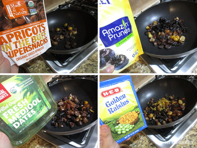 Add the apricots, plums and dates. Stir fry for another 3 minutes. Add raisins and mix for another minute, being careful not to burn the fruits. Remove from heat and cool slightly.