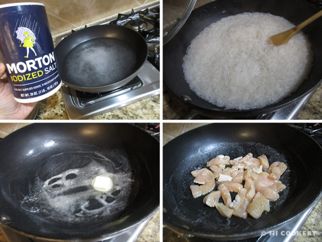 In a large pot, boil 10 cups of water and the remaining 2 tablespoons of salt. Pick up the soaked rice from the bowl and add to the pot. Parboil for 7-10 minutes till the rice is ALMOST cooked (not too hard and not too soft as it will continue cooking with the fruit mix and chicken). In another large nonstick pot, melt 1 tablespoon butter over low heat and add the chicken but do not brown it.