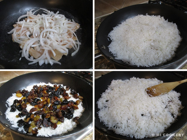 Scatter onions evenly over the chicken and let it sit for a minute. Turn up heat to medium low and gently stir to mix. Add half the rice over the onion-chicken mixture. Then scatter the fruits over the top. Layer the rest of the rice over the fruits.