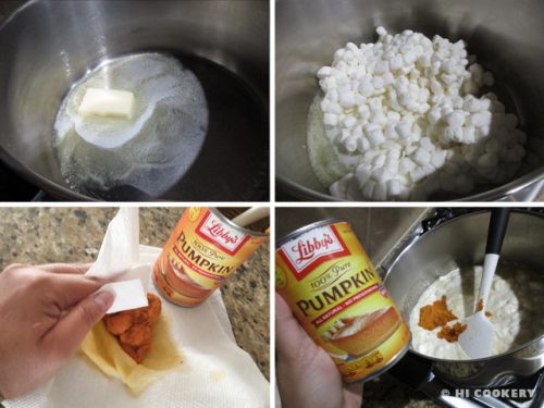 In a large saucepan, melt the butter over low heat. Stir in the marshmallows and pumpkin puree.