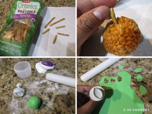 Break pretzel sticks in half. Insert into the cereal rounds. On a clean surface lightly dusted with powdered sugar, roll out a little bit of green fondant to 1/16-inch thick. Cut out fondant leaves.