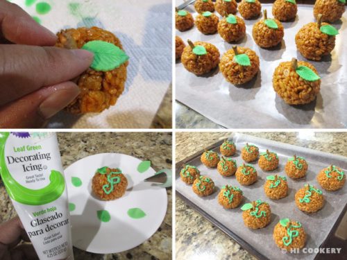 Place fondant leaves on the rice cereal pumpkins (brush a small amount of water on the back of the leaves to make them stick to the treats). Use a small round tip to pipe tendrils from a tube of green frosting. Store in a tightly sealed container until ready to serve.