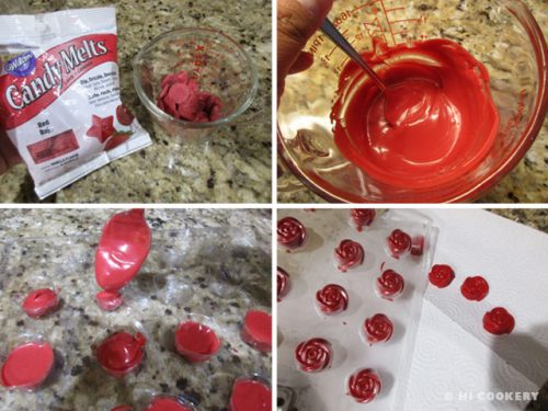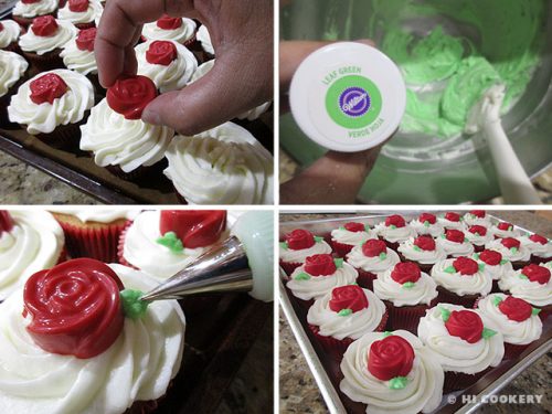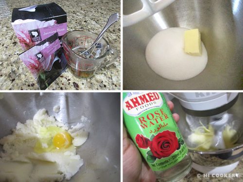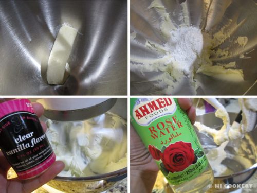 Mix the softened gelatin into the sweetened cream. In a medium bowl, cream the mascarpone cheese. Pour the hot cream mixture over it and stir to remove the lumps. Mix in the rose water. Tint with food coloring.
