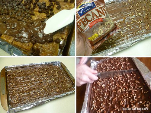 Spread the melted chocolate evenly over the top (return to the oven for a minute or two if needed to melt more). Sprinkle with nuts. Let cool to room temperature then place in the refrigerator to set until firm. Slice or break into pieces. Store chilled in airtight container.
